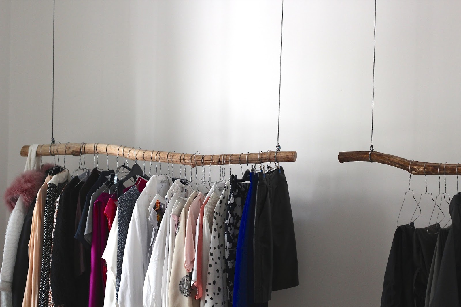 DE: Schon bevor ich in meine neue Wohnung gezogen bin, war klar: Ich brauche diese verhipsterten hängenden Kleiderstangen in meinem Schlafzimmer! Der positive Nebeneffekt an der ganzen Sache: Ich spare bares Geld! Diese Kleiderstangen kosten nämlich so gut wie nichts: Die Hölzer habe ich aus dem Wald (am besten ihr nehmt Äste, die schon auf dem Boden liegen), dazu kommen noch Seile  und Deckenhaken aus dem Baumarkt (die schönsten Seile bekommt man übrigens in der Abteilung für Schiffsseile im Baumarkt). Die Äste habe ich mir dann auf die gewünschte Länge gesägt und mit etwas Schleifpapier glatt geschliffen. Dann die Haken in die Decke bohren, die Seile befestigen et voilà! Fertig ist die äußert stilvolle und günstige Art der Kleiderpräsentation.