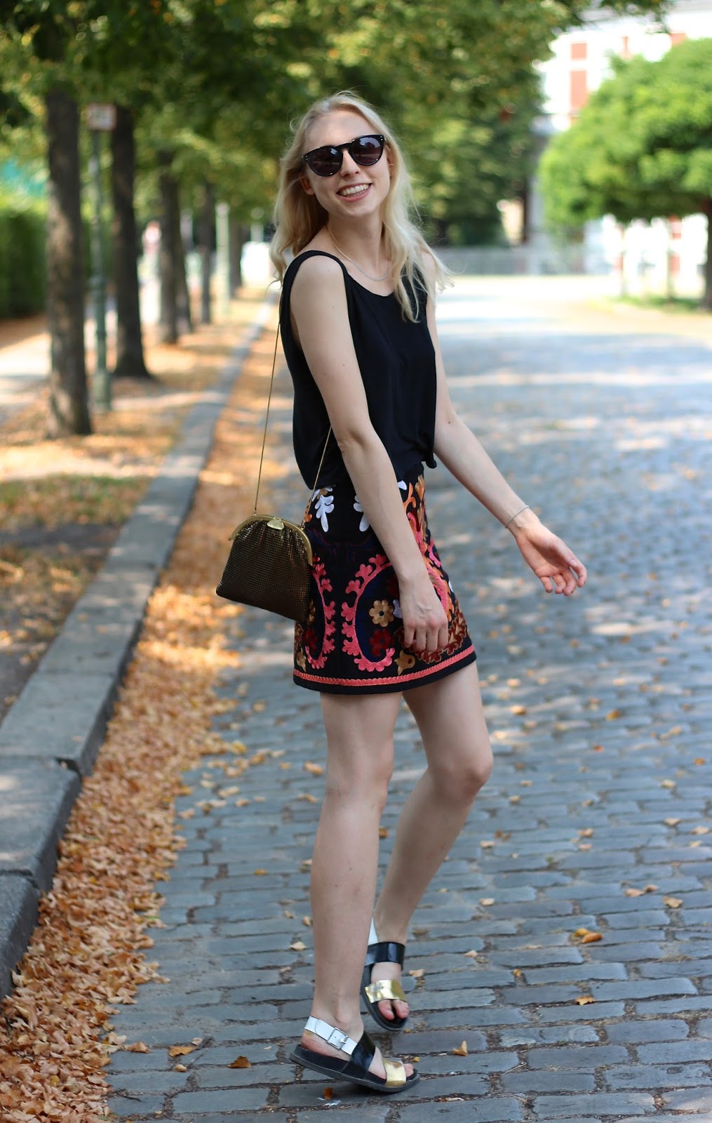 What a wonderful sunny sunday! I could lay hours in the grass, reading books and doing nothing. To celebrate the last sunny days in Berlin I’m wearing a mini skirt with 70’s style embroidery, a basic shirt and my favorite slides. So that’s it for today, my book is so exciting and the evening sun so wonderful! Enjoy the last sunny hours <3